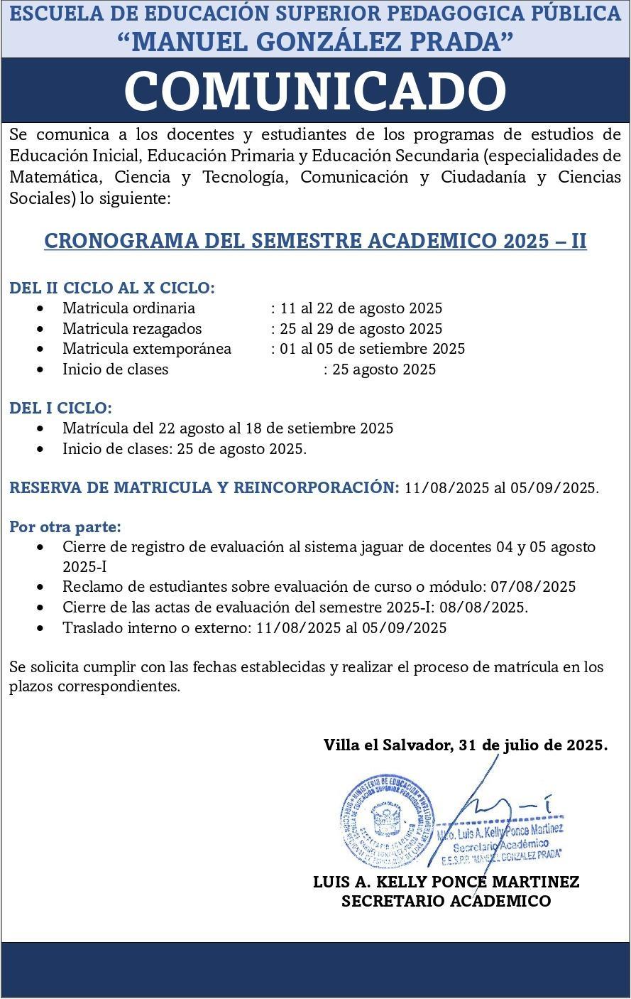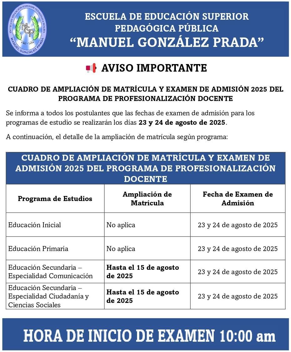 01 agosto “Cronograma de Ampliación de Matrícula y Examen de Admisión 2025 – Programa de Profesionalización Docente” Read More
